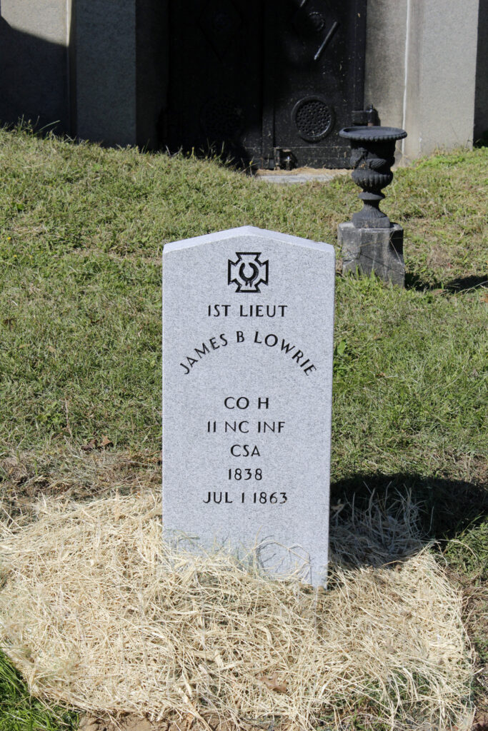 His brothers would also serve the Confederacy. Captain Patrick Johnston Lowrie also served in Co. H, 11th NC as the commissary officer. He died of disease on 12 Jul 1862 in Wilmington, NC. Captain Houston B. Lowrie would serve with Co. C, 6th North Carolina Infantry and was killed at the Battle of Antietam on 17 Sep 1862. Captain Samuel Lowrie served with the 8th Texas Rangers, surrendering with his regiment near Greensboro, NC in April 1865. Samuel would be the only brother to survive the war, passing way in 1892 in DeLand, Florida.